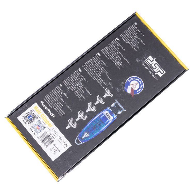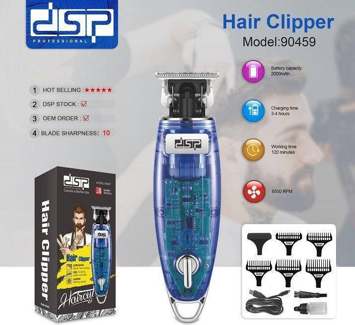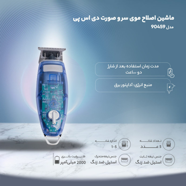 برای انتخاب یک ماشین اصلاح به نکات زیادی باید توجه کرد از جمله دارا بودن تیغههای تیز و دقیق، قابل شارژ بودن و تولید صدا و لرزش کم که ماشین اصلاح دی اس پی مدل90459 همه ی این ویژگیها را در کنار هم دارد و یک اصلاح کامل را به شما هدیه می دهد. یکی از مزیتهای مهم این ابزار اصلاح طراحی ظاهری آن است که به گونه ایی است که درون آن به راحتی قابل دیدن است. داشتن تیغههای ضد زنگ از دیگر ویژگیهای مهم این ماشین اصلاح است که در کنار داشتن دقت و ظرافت در اصلاح و خط زدن طول عمر بالایی نیز دارد. ماشین اصلاح دی اس پی مدل90459 دارای باتری لیتیومی 2000 میلی آمپر است که پس از 180 دقیقه شارژ شدن تا 120 دقیقه می توان از آن استفاده نمود. اقلام همراه ماشین اصلاح دی اس پی مدل90459 شامل برس تمیز کننده، بطری روغن، درپوش حفاظتی تیغه و پنج عدد شانه در سایزهای 1 تا پنج میلی متر است که برای اصلاح موها در سایزها و مدلهای مختلف مناسب است.