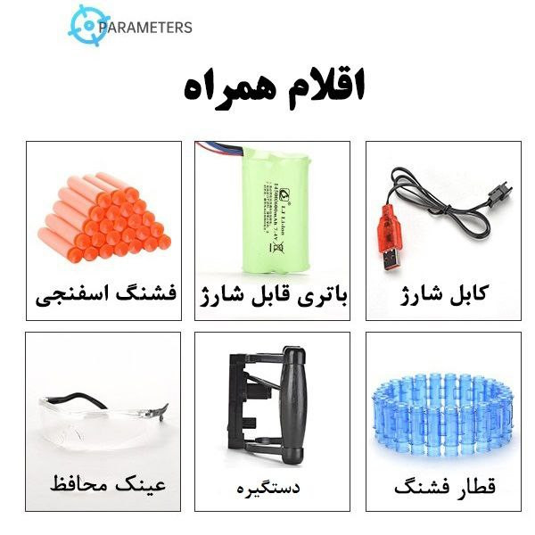 اقلام همراه:کابل شارژ.باتری قابل شارژ.قشنگ اسفنجی.قطار فشنگ.دستگیره.عینک محافظ